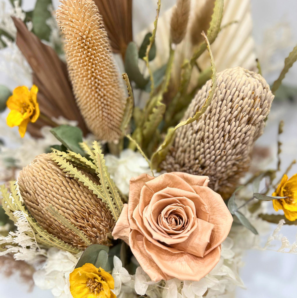 Native Rose Everlasting Arrangment in Yellow Ceramic Pot